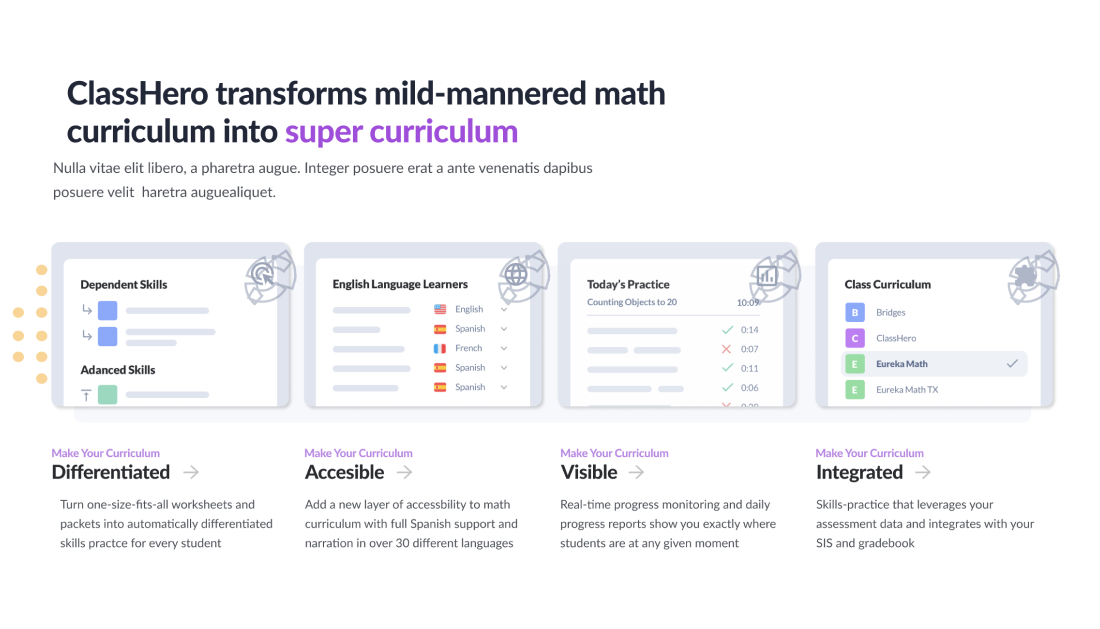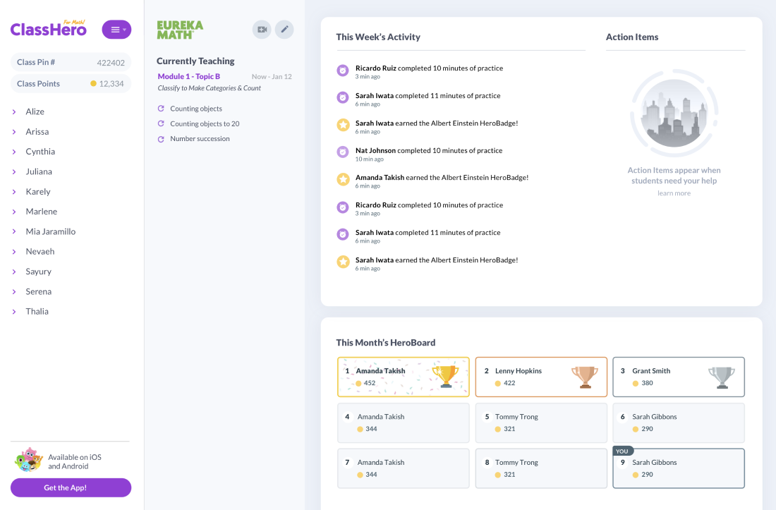 The Class Hero Teacher app was designed for simplicity. With one dashboard, a teacher could assign popular math curriculums, personalize assignments based on individual students, monitor and review progress, and even distribute awards.